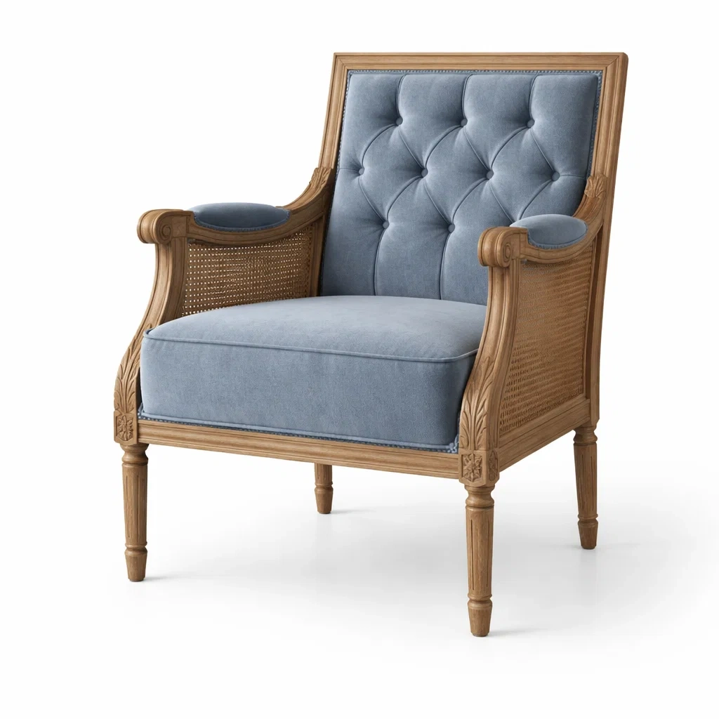 Structure en bois massif avec accoudoirs et dossier en cannage.