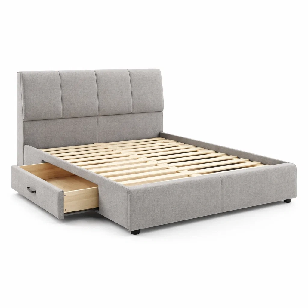 Lit avec rangement en tissu et bois avec tiroir gris